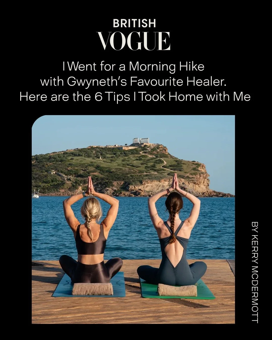 Two women practicing yoga outdoors on a wooden dock, facing a body of water and an island with a hill and buildings on top, during the daytime.
